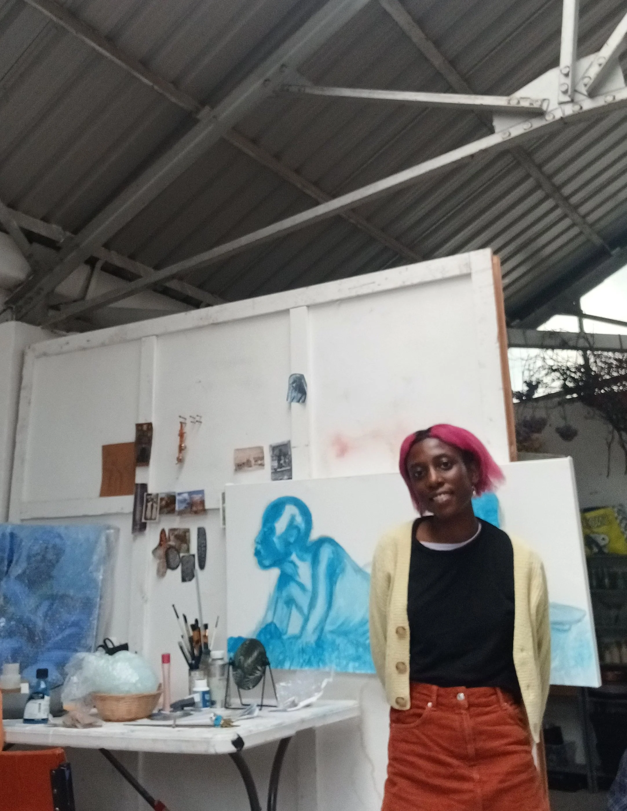 Saint Takyi (b. 1997, Amsterdam) is a figurative artist who uses narrative in their works. They graduated in MA Painting from the Royal College of Art in 2024, supported by the Sir Frank Bowling scholarship. They recently became the winner of the prestigious 2024 Ingram Art Prize. Saint uses the colour blue as a base, leaning on blue’s rarity in nature to create environments with ephemeral humanoids that symbolise the narratives from their daydreams, and memories. Their practice fuses elements of Ghanaian folklore and worldbuilding with anthropological photography.